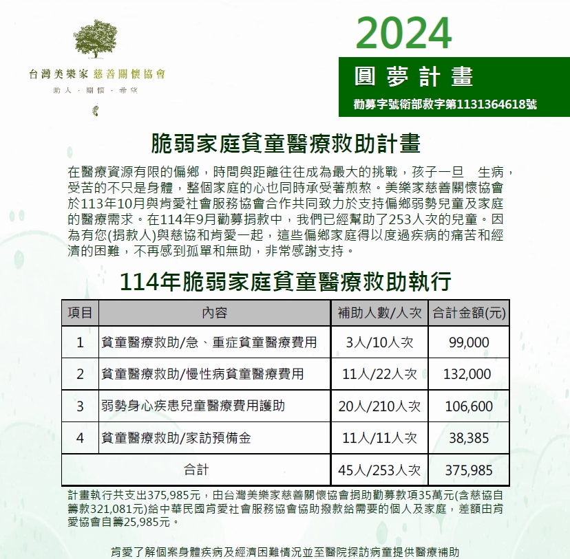 「台灣美樂家慈善關懷協會」以實際行動發揮助人精神,看到每一位受救助者重新站起來,就是我們最大的成就! 期盼您一同加入我們,在圓夢計畫 的路上,一起幫助更多需要幫助的人。